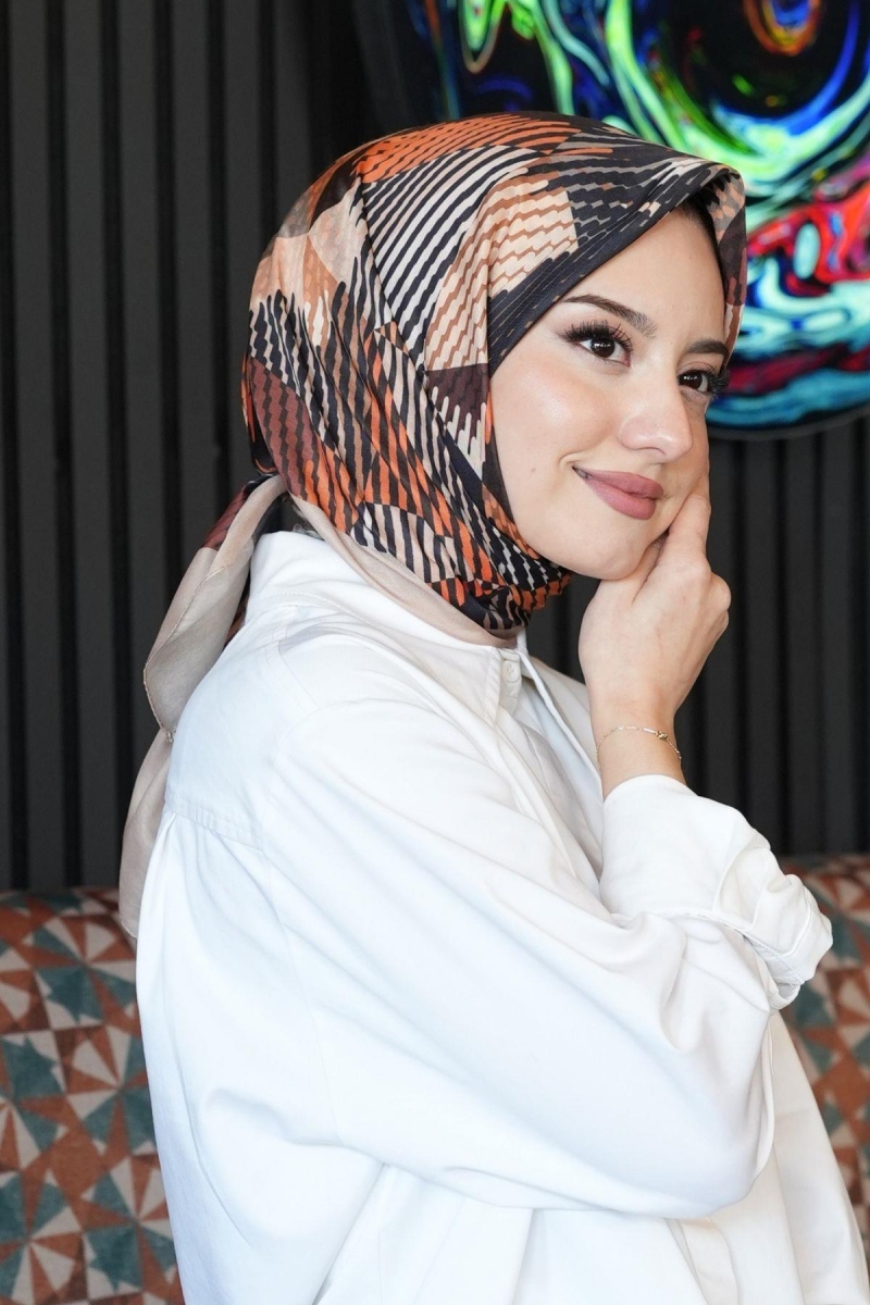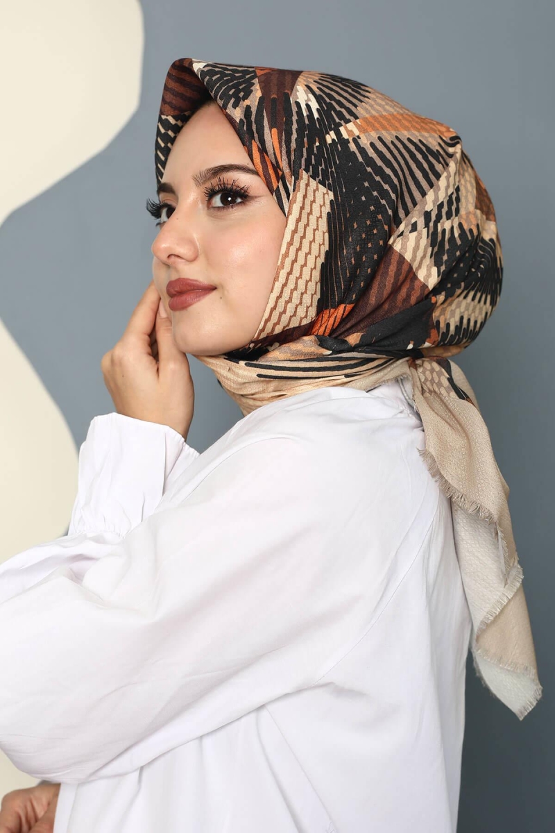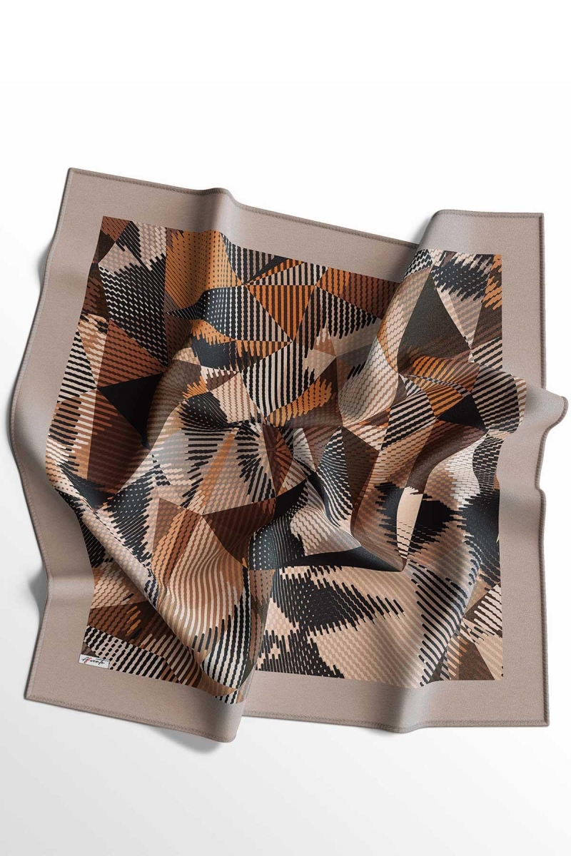 Soyut Desen Açık Kahverengi Pamuk Eşarp;Ölçü:95x95;Kumaş:%50 Pamuk %50 Polyester;Dört mevsim kullanıma uygundur.;Kolayca şekil alır, önü tok ve dik durur.; Solmaya ve kırışmaya dayanıklıdır.; İç göstermez,kayma yapmaz.; Ütü gerektirmez.;Kullanılan ışıklardan dolayı renk farklılıkları olabilir.