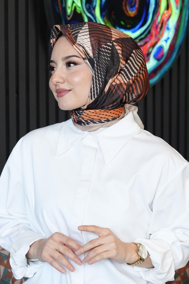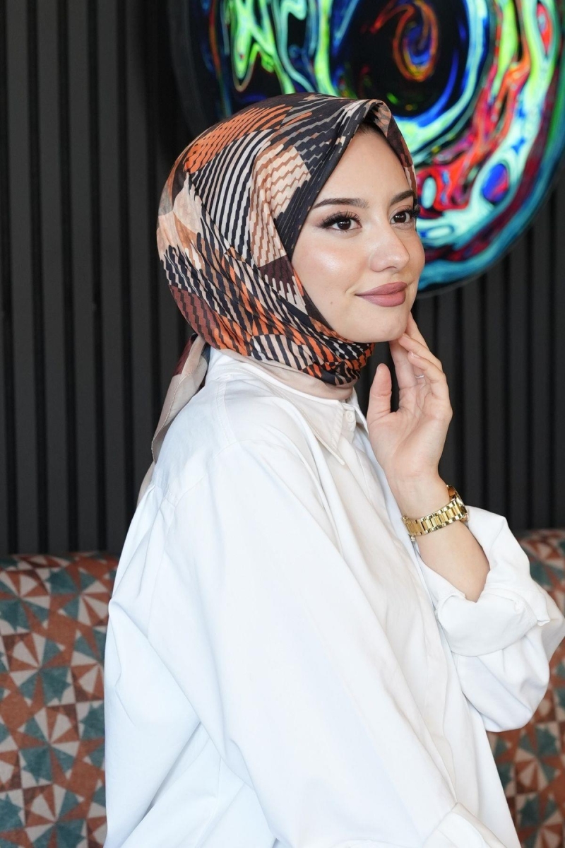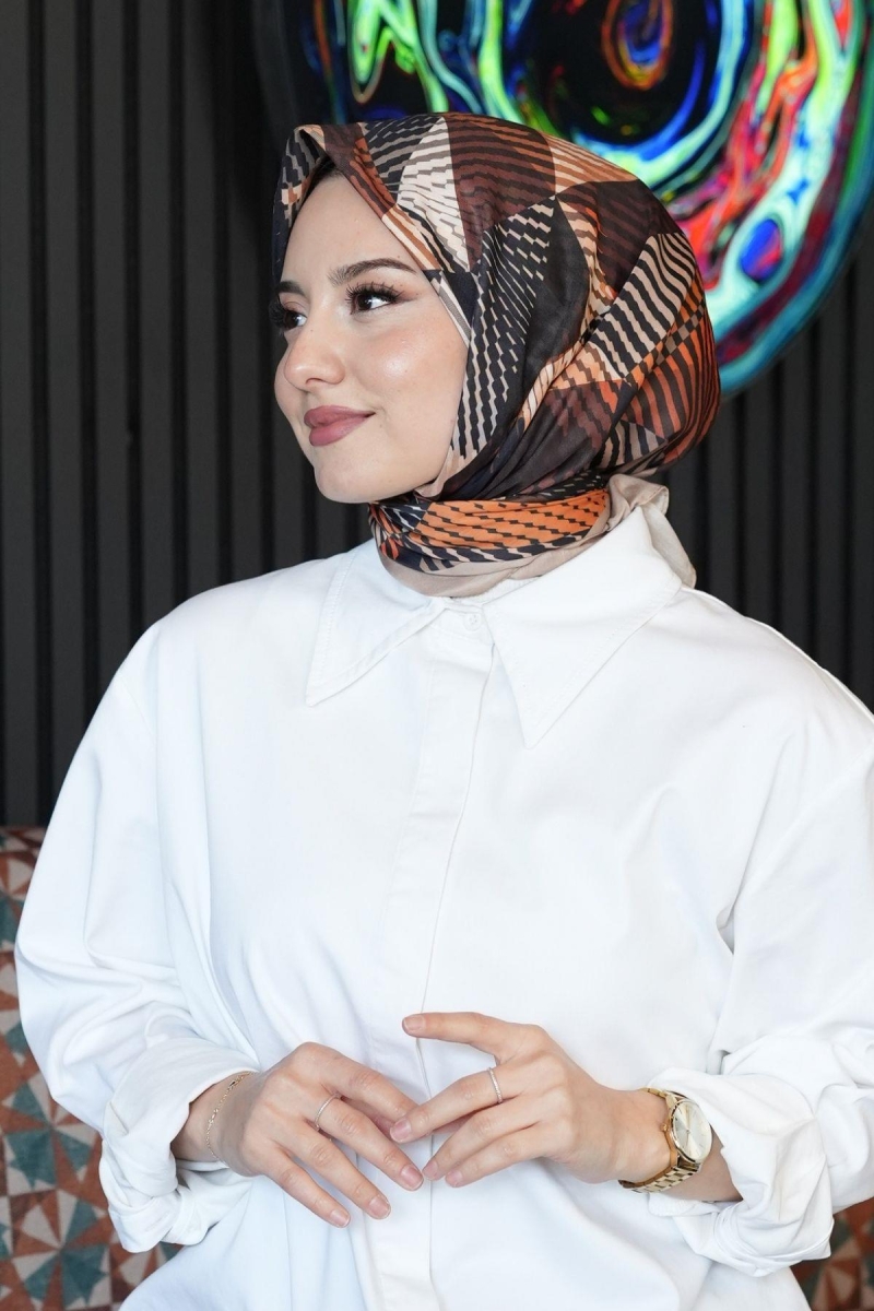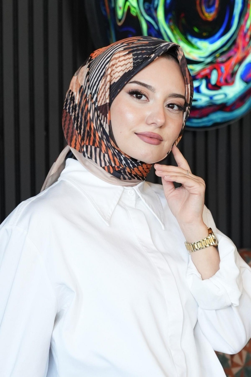 Soyut Desen Açık Kahverengi Pamuk Eşarp;Ölçü:95x95;Kumaş:%50 Pamuk %50 Polyester;Dört mevsim kullanıma uygundur.;Kolayca şekil alır, önü tok ve dik durur.; Solmaya ve kırışmaya dayanıklıdır.; İç göstermez,kayma yapmaz.; Ütü gerektirmez.;Kullanılan ışıklardan dolayı renk farklılıkları olabilir.