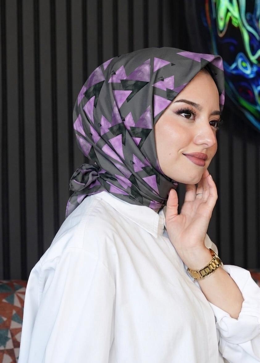 Üçgen Desen Mor Pamuk Eşarp;Ölçü:95x95;Kumaş:%50 Pamuk %50 Polyester;Dört mevsim kullanıma uygundur.;Kolayca şekil alır, önü tok ve dik durur.; Solmaya ve kırışmaya dayanıklıdır.; İç göstermez,kayma yapmaz.; Ütü gerektirmez.;Kullanılan ışıklardan dolayı renk farklılıkları olabilir.