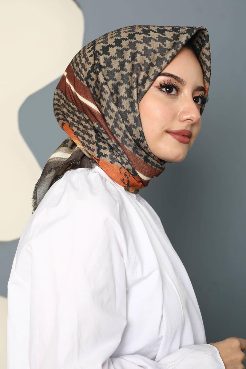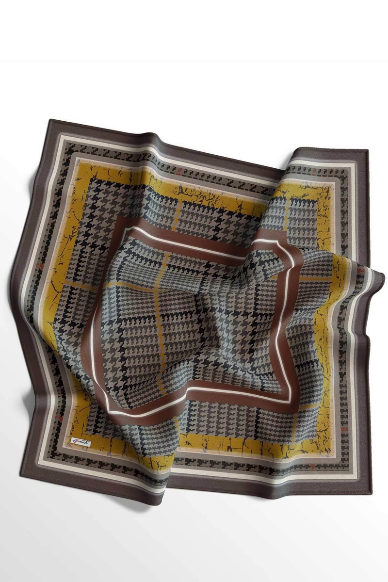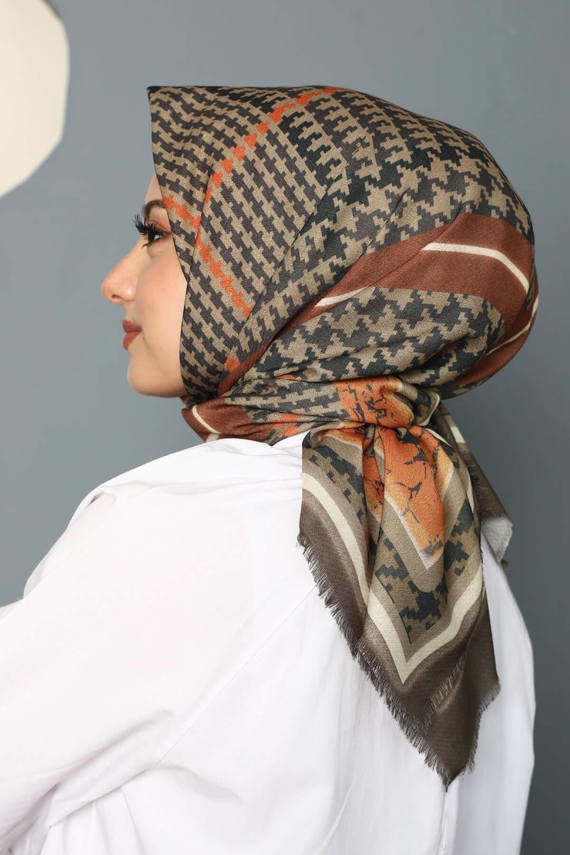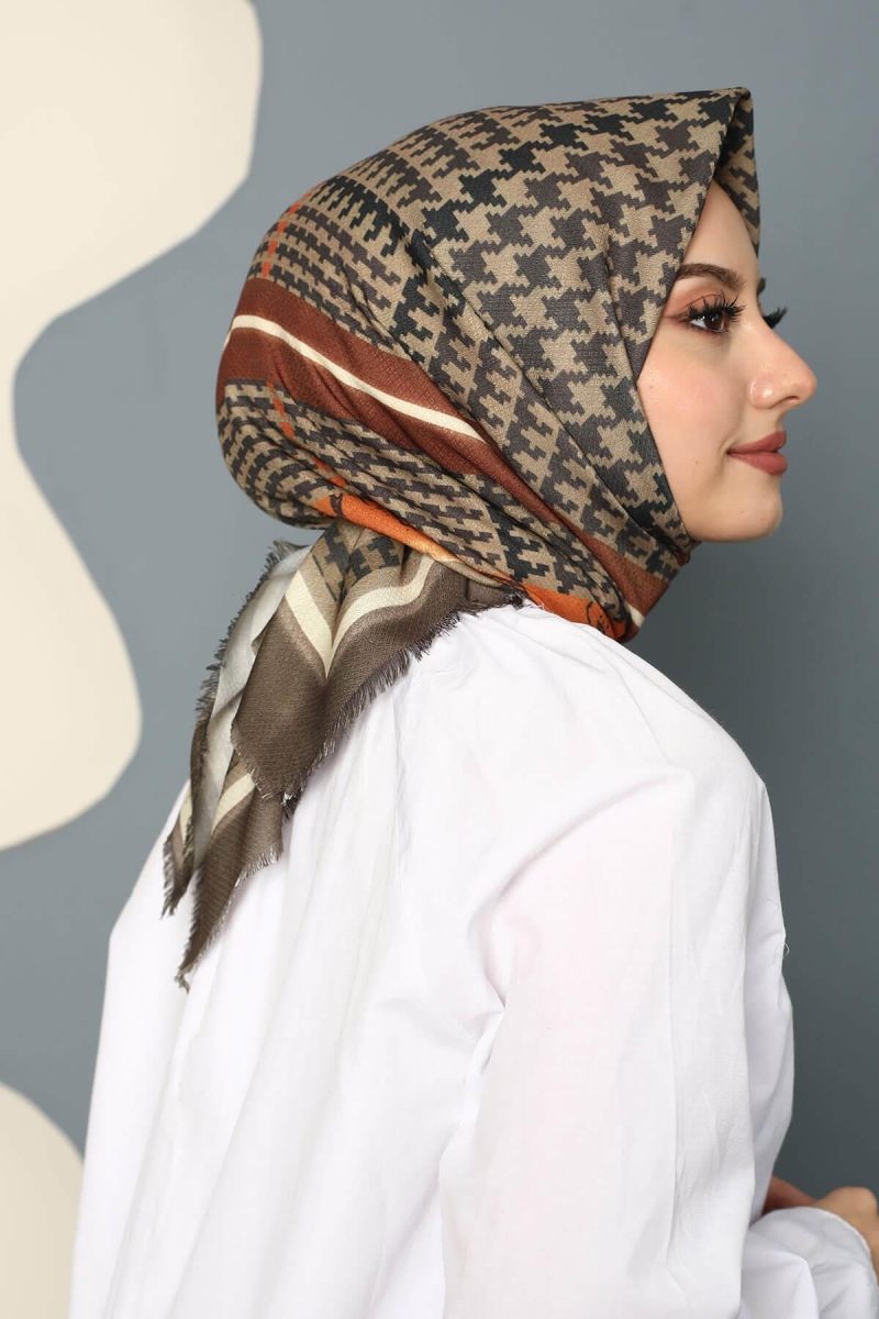 Soyut Desen Kahverengi Pamuk Eşarp;Ölçü:95x95;Kumaş:%50 Pamuk %50 Polyester;Dört mevsim kullanıma uygundur.;Kolayca şekil alır, önü tok ve dik durur.; Solmaya ve kırışmaya dayanıklıdır.; İç göstermez,kayma yapmaz.; Ütü gerektirmez.;Kullanılan ışıklardan dolayı renk farklılıkları olabilir.