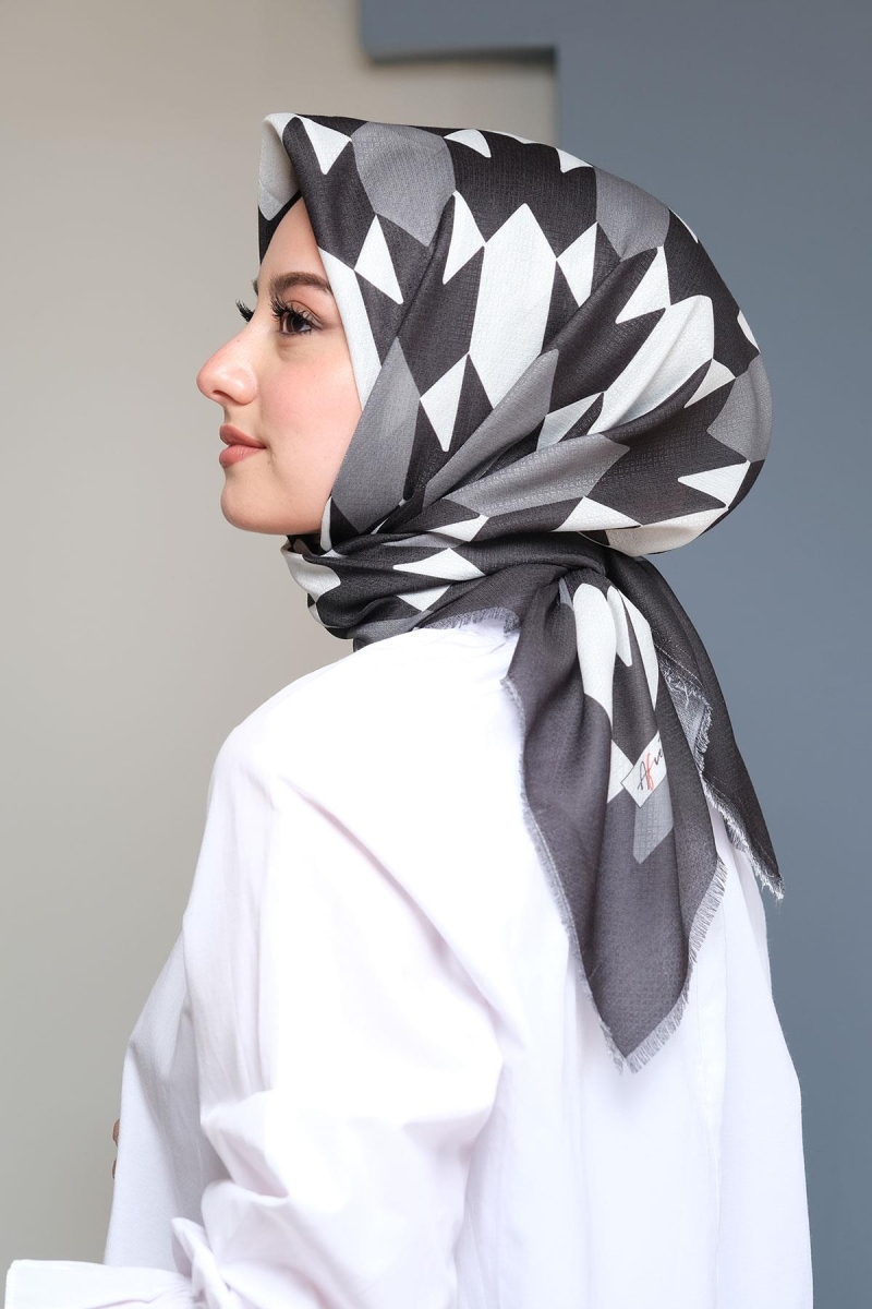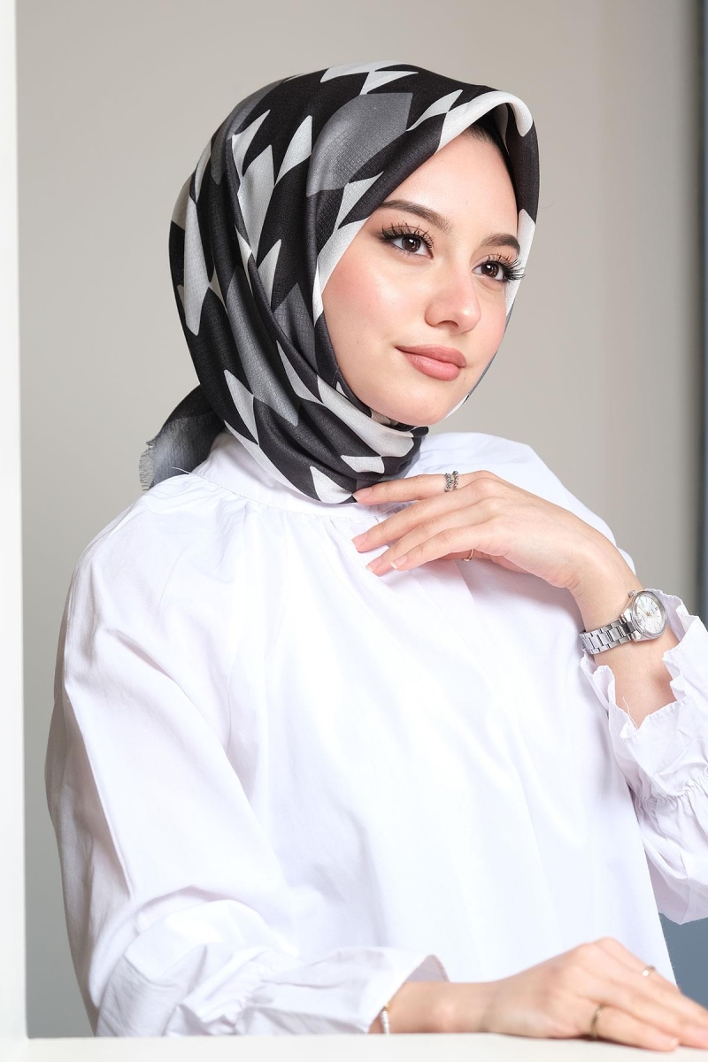 Geometrik Desen Siyah - Beyaz Pamuk Eşarp;Ölçü:95x95;Kumaş:%50 Pamuk %50 Polyester;Dört mevsim kullanıma uygundur.;Kolayca şekil alır, önü tok ve dik durur.; Solmaya ve kırışmaya dayanıklıdır.; İç göstermez,kayma yapmaz.; Ütü gerektirmez.;Kullanılan ışıklardan dolayı renk farklılıkları olabilir.