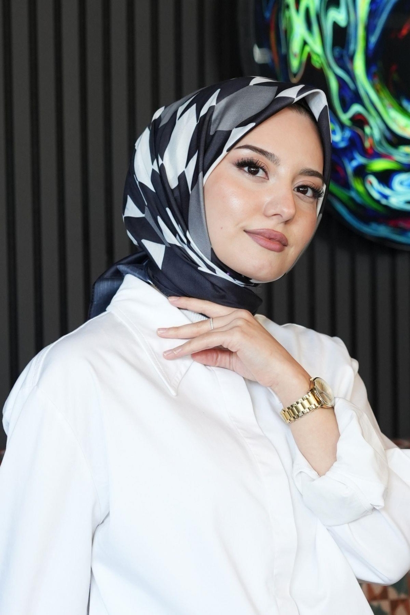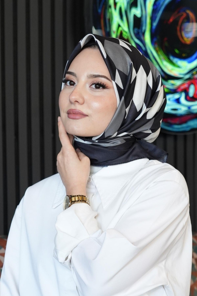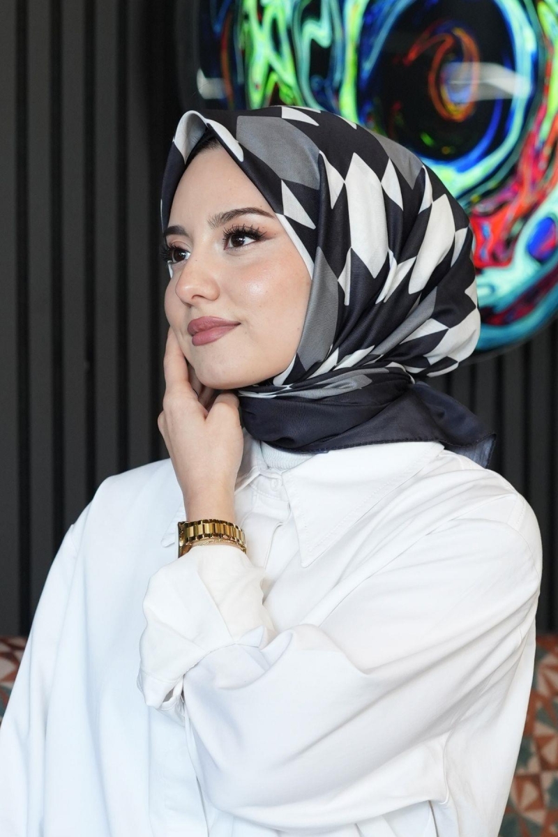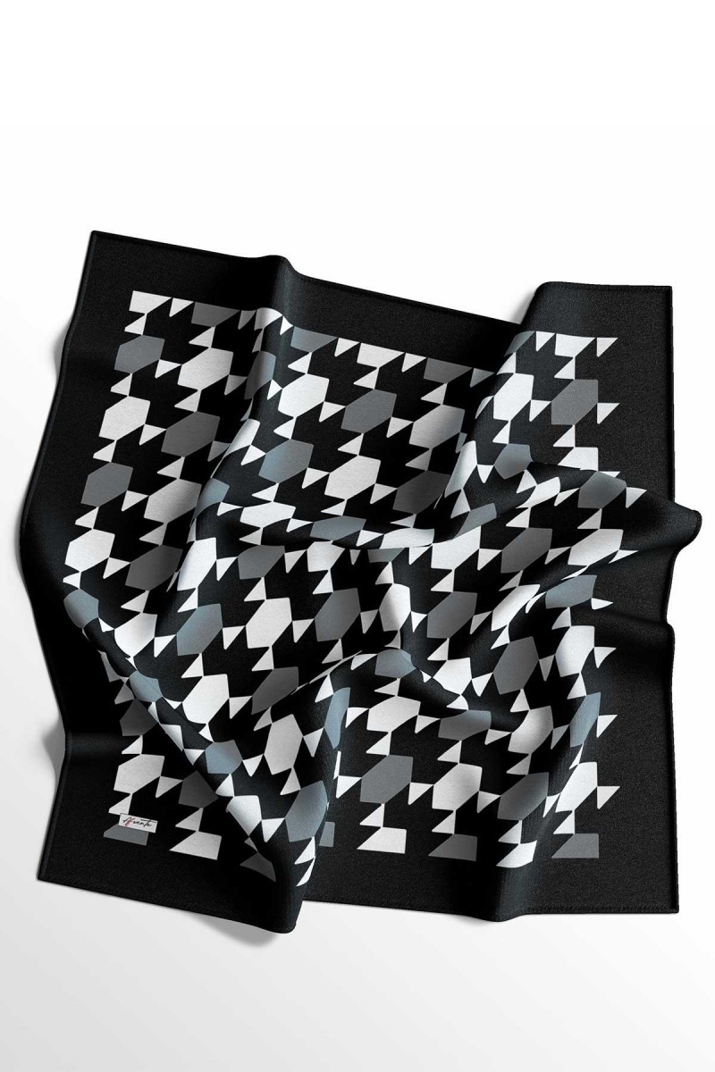 Geometrik Desen Siyah - Beyaz Pamuk Eşarp;Ölçü:95x95;Kumaş:%50 Pamuk %50 Polyester;Dört mevsim kullanıma uygundur.;Kolayca şekil alır, önü tok ve dik durur.; Solmaya ve kırışmaya dayanıklıdır.; İç göstermez,kayma yapmaz.; Ütü gerektirmez.;Kullanılan ışıklardan dolayı renk farklılıkları olabilir.