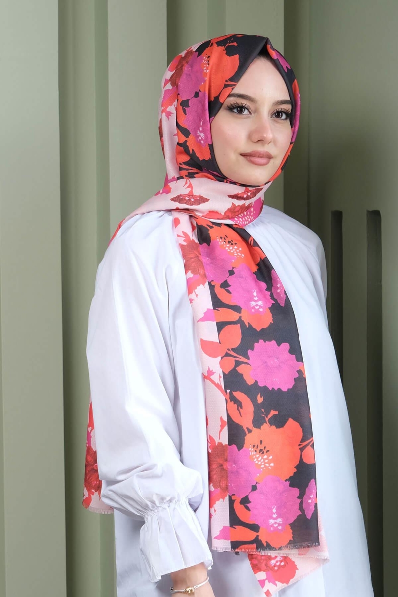 Çiçek Desen Pembe Pamuk Şal;Ölçü:75x185;Kumaş:%50 Pamuk %50 Polyester;Dört mevsim kullanıma uygundur.;Kolayca şekil alır, önü tok ve dik durur.; Solmaya ve kırışmaya dayanıklıdır.; İç göstermez,kayma yapmaz.; Ütü gerektirmez.;Kullanılan ışıklardan dolayı renk farklılıkları olabilir.