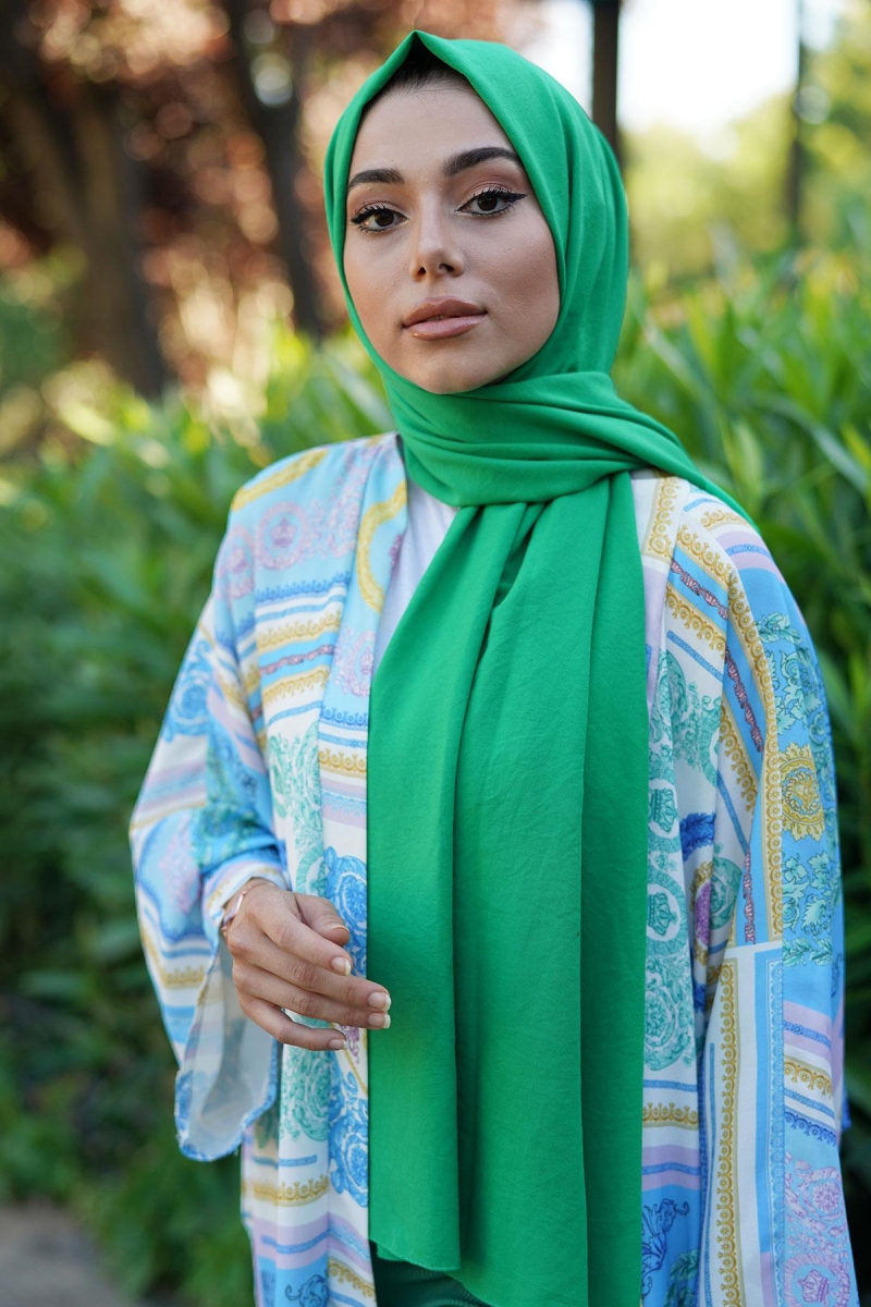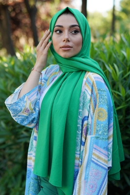 Benetton Yeşili Pamuk Cazz Şal;Ölçü:75x180;Kumaş:%70 Pamuk %30 Polyester;Dört mevsim kullanıma uygundur.;Kolayca şekil alır, önü tok ve dik durur.; Solmaya ve kırışmaya dayanıklıdır.; İç göstermez,kayma yapmaz.; Ütü gerektirmez.;Kullanılan ışıklardan dolayı renk farklılıkları olabilir.