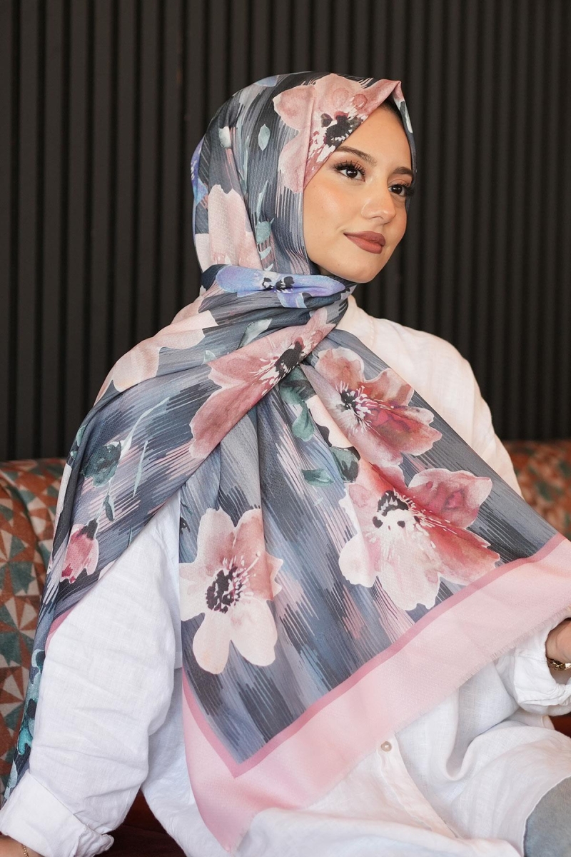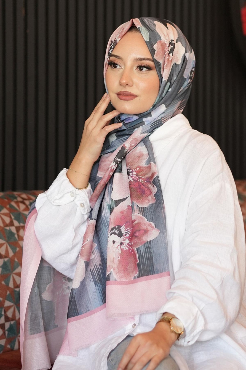 Çizgi Çiçek Desen Füme Pamuk Şal;Ölçü:75x185;Kumaş:%50 Pamuk %50 Polyester;Dört mevsim kullanıma uygundur.;Kolayca şekil alır, önü tok ve dik durur.; Solmaya ve kırışmaya dayanıklıdır.; İç göstermez,kayma yapmaz.; Ütü gerektirmez.;Kullanılan ışıklardan dolayı renk farklılıkları olabilir.