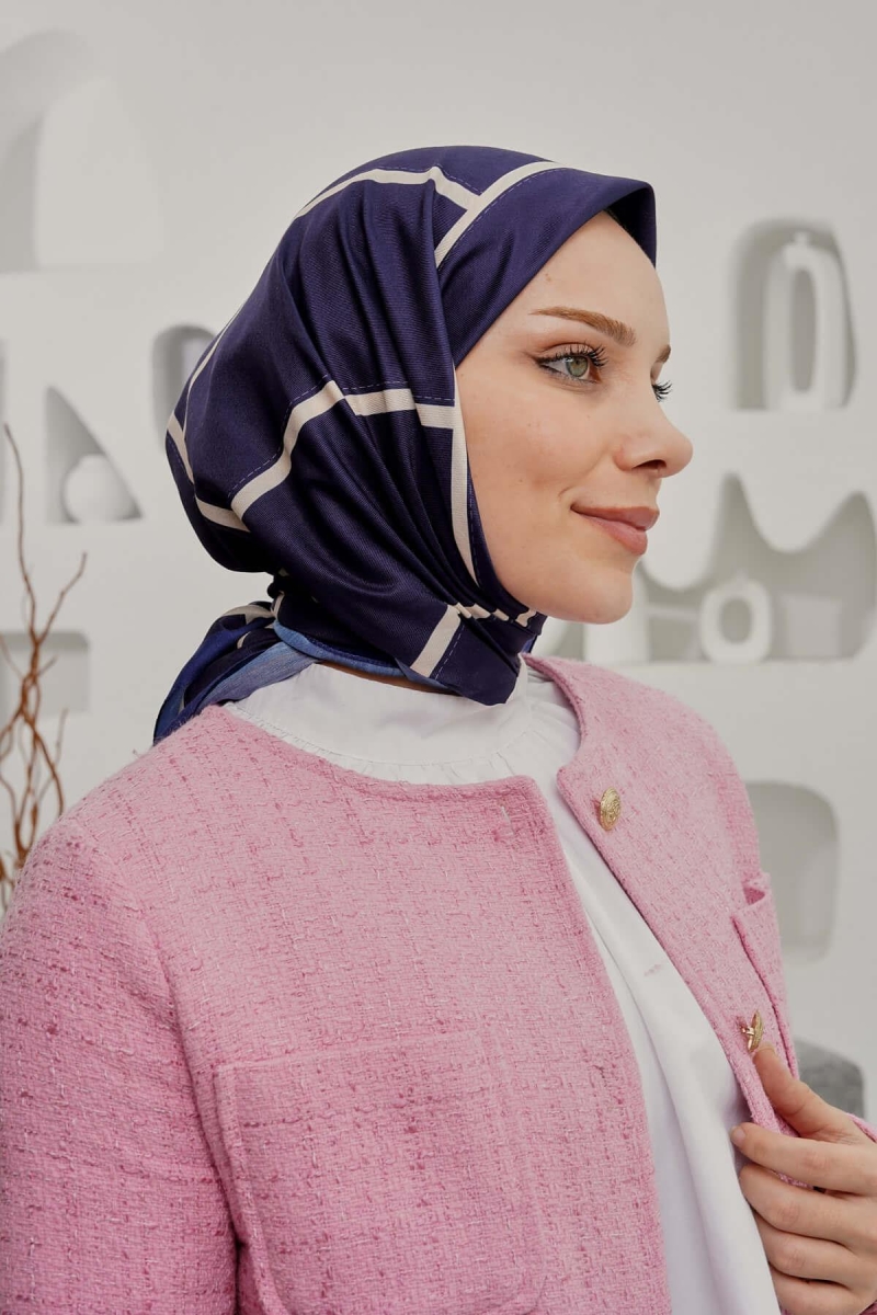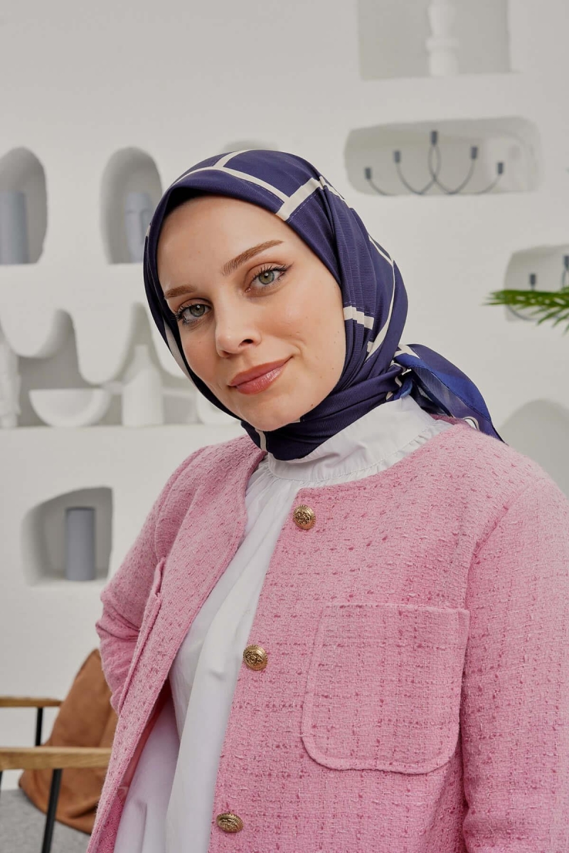 Geometrik Desen Koyu Mavi Soft Pamuk Eşarp;Ölçü:95x95;Kumaş:%50 Pamuk %50 Polyester;Dört mevsim kullanıma uygundur.;Kolayca şekil alır, önü tok ve dik durur.; Solmaya ve kırışmaya dayanıklıdır.; İç göstermez,kayma yapmaz.; Ütü gerektirmez.;Kullanılan ışıklardan dolayı renk farklılıkları olabilir.