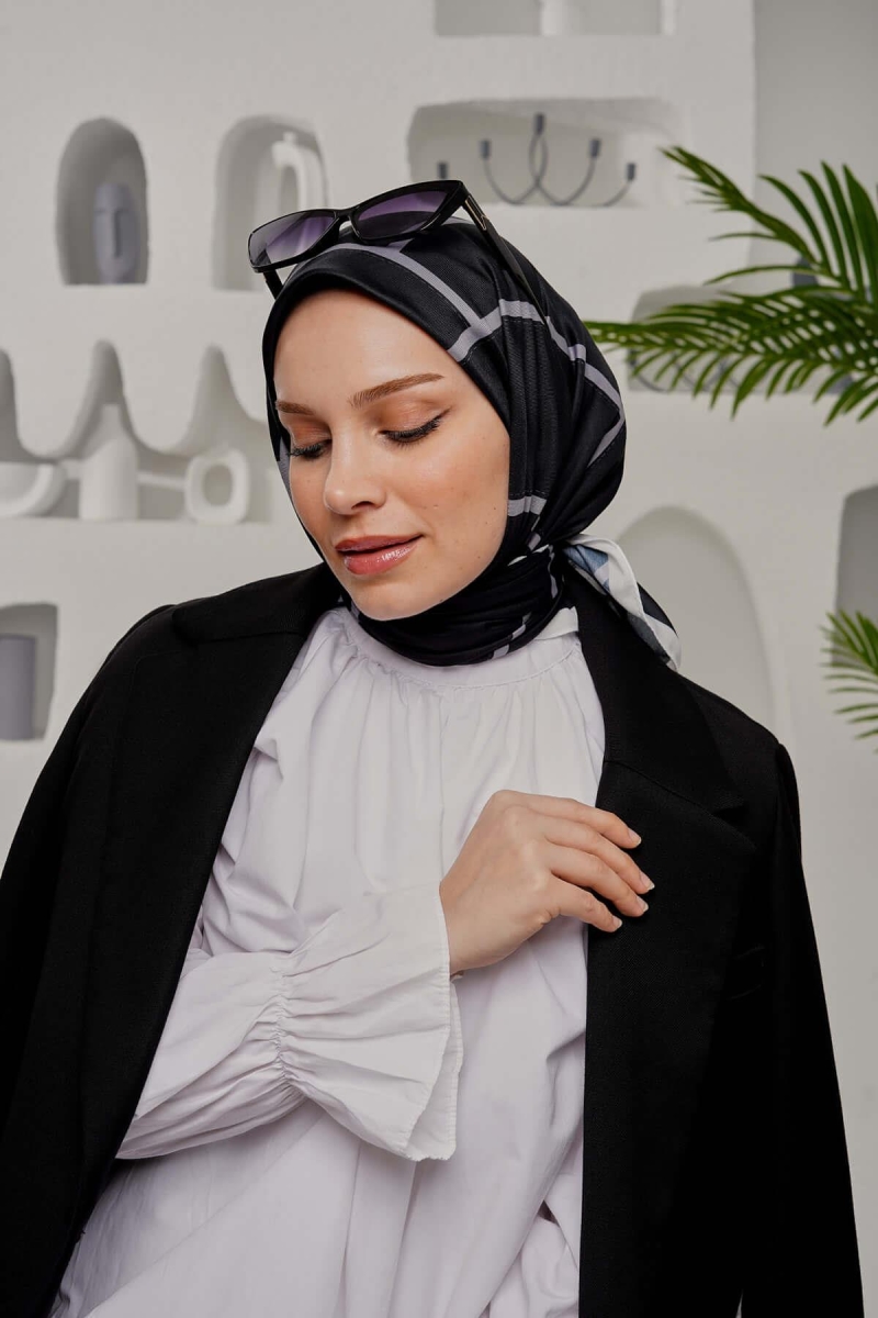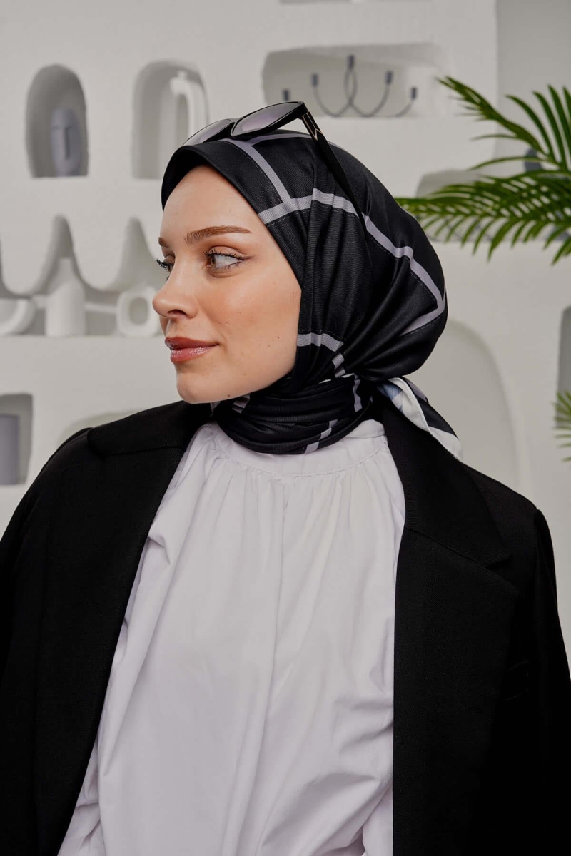 Geometrik Desen Siyah Soft Pamuk Eşarp;Ölçü:95x95;Kumaş:%50 Pamuk %50 Polyester;Dört mevsim kullanıma uygundur.;Kolayca şekil alır, önü tok ve dik durur.; Solmaya ve kırışmaya dayanıklıdır.; İç göstermez,kayma yapmaz.; Ütü gerektirmez.;Kullanılan ışıklardan dolayı renk farklılıkları olabilir.