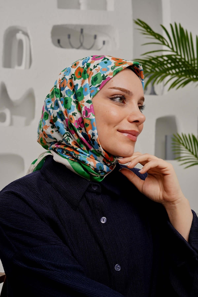Çiçek Desen Yeşil Soft Pamuk Eşarp;Ölçü:95x95;Kumaş:%50 Pamuk %50 Polyester;Dört mevsim kullanıma uygundur.;Kolayca şekil alır, önü tok ve dik durur.; Solmaya ve kırışmaya dayanıklıdır.; İç göstermez,kayma yapmaz.; Ütü gerektirmez.;Kullanılan ışıklardan dolayı renk farklılıkları olabilir.