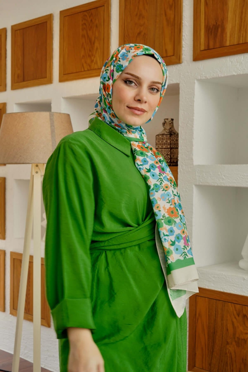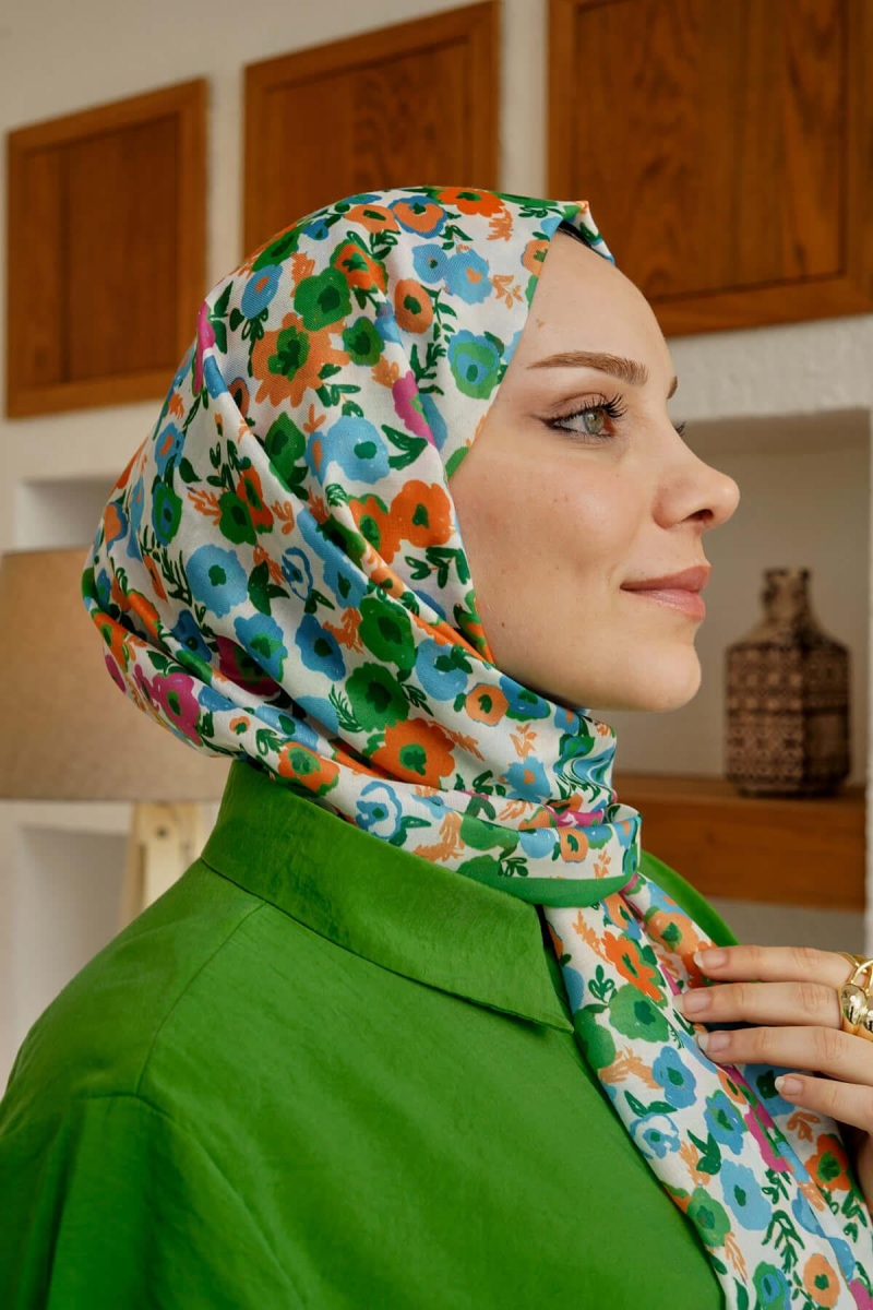 Çiçek Desen Yeşil Soft Pamuk Şal;Ölçü:75x185;Kumaş:%50 Pamuk %50 Polyester;Dört mevsim kullanıma uygundur.;Kolayca şekil alır, önü tok ve dik durur.; Solmaya ve kırışmaya dayanıklıdır.; İç göstermez,kayma yapmaz.; Ütü gerektirmez.;Kullanılan ışıklardan dolayı renk farklılıkları olabilir.