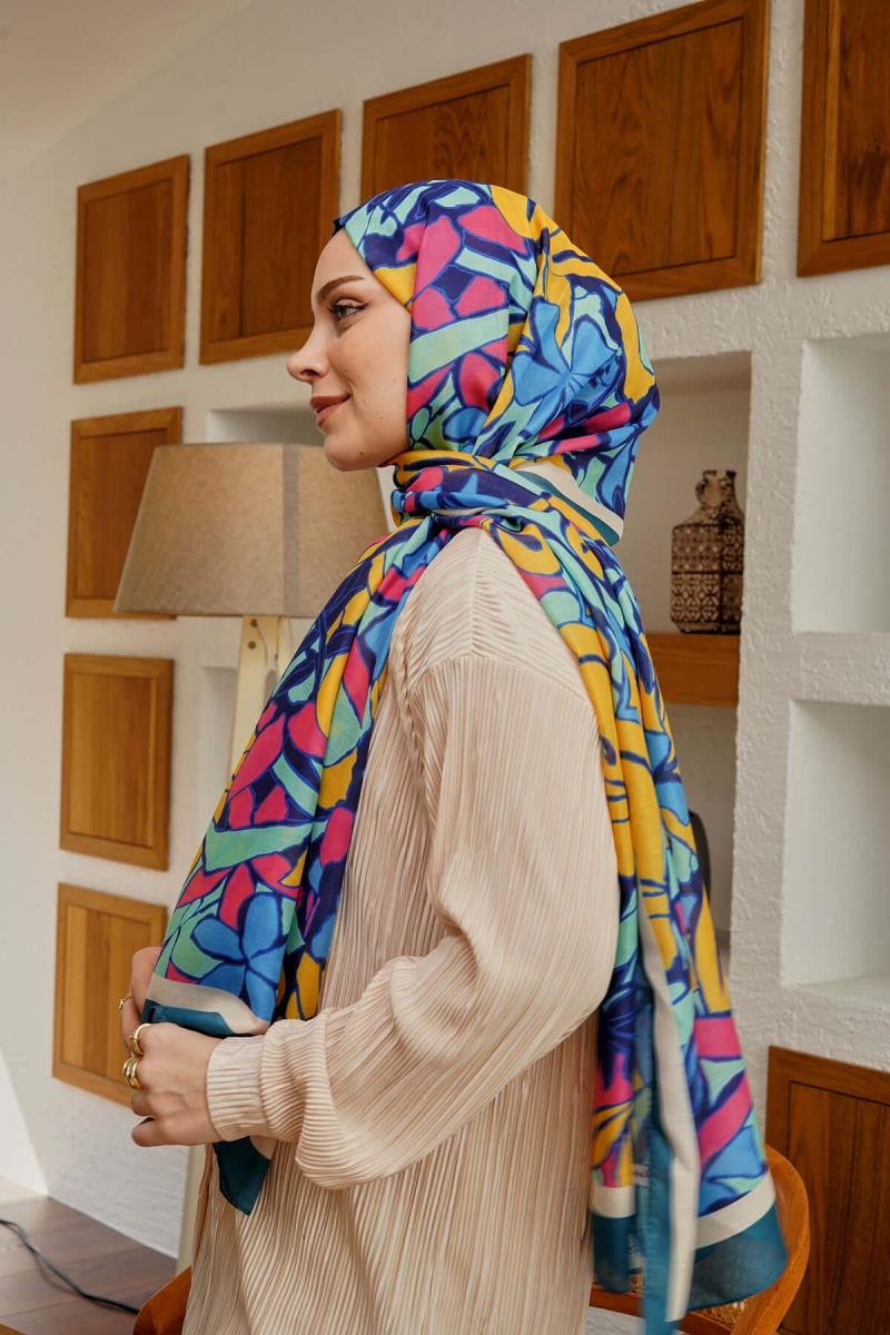 Çiçek Desen Mavi Soft Pamuk Şal;Ölçü:75x185;Kumaş:%50 Pamuk %50 Polyester;Dört mevsim kullanıma uygundur.;Kolayca şekil alır, önü tok ve dik durur.; Solmaya ve kırışmaya dayanıklıdır.; İç göstermez,kayma yapmaz.; Ütü gerektirmez.;Kullanılan ışıklardan dolayı renk farklılıkları olabilir.