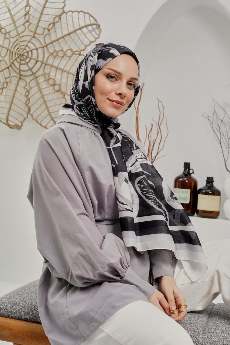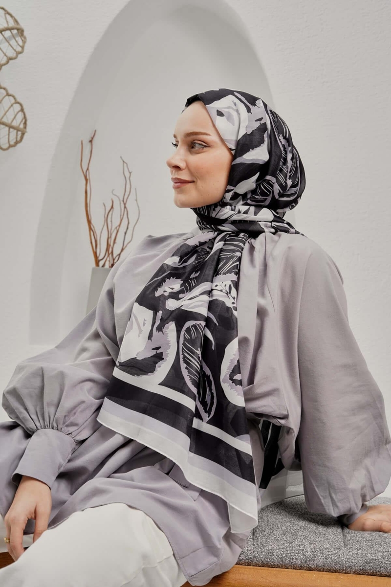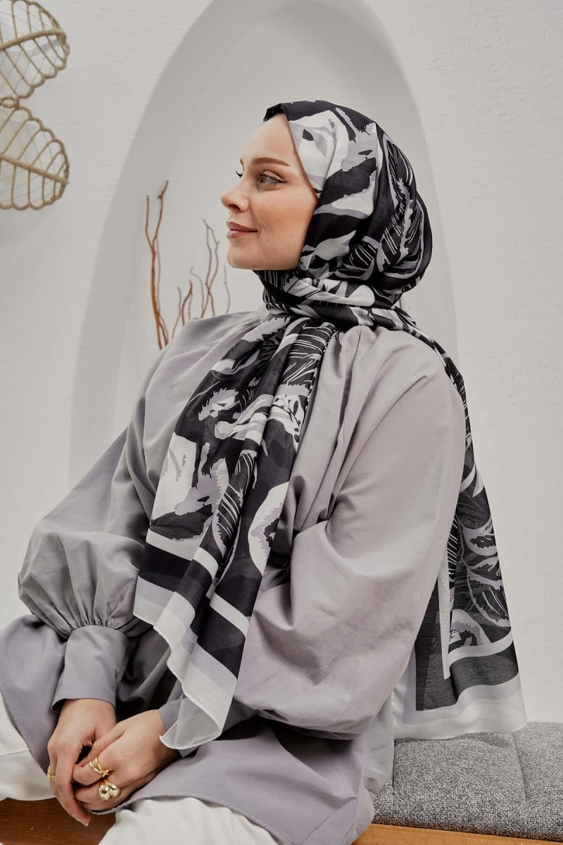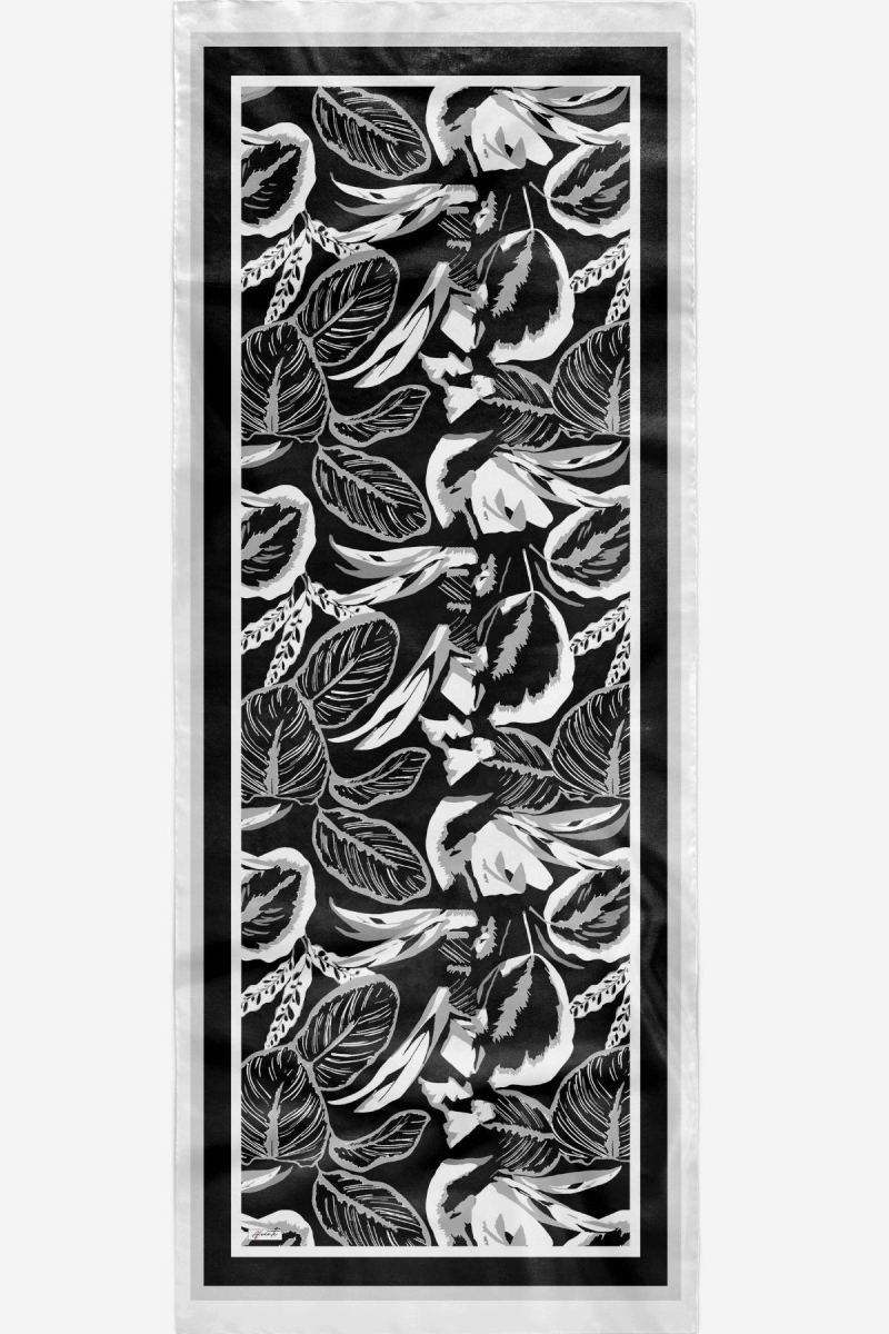 Yaprak Desen Siyah Soft Pamuk Şal;Ölçü:75x185;Kumaş:%50 Pamuk %50 Polyester;Dört mevsim kullanıma uygundur.;Kolayca şekil alır, önü tok ve dik durur.; Solmaya ve kırışmaya dayanıklıdır.; İç göstermez,kayma yapmaz.; Ütü gerektirmez.;Kullanılan ışıklardan dolayı renk farklılıkları olabilir.