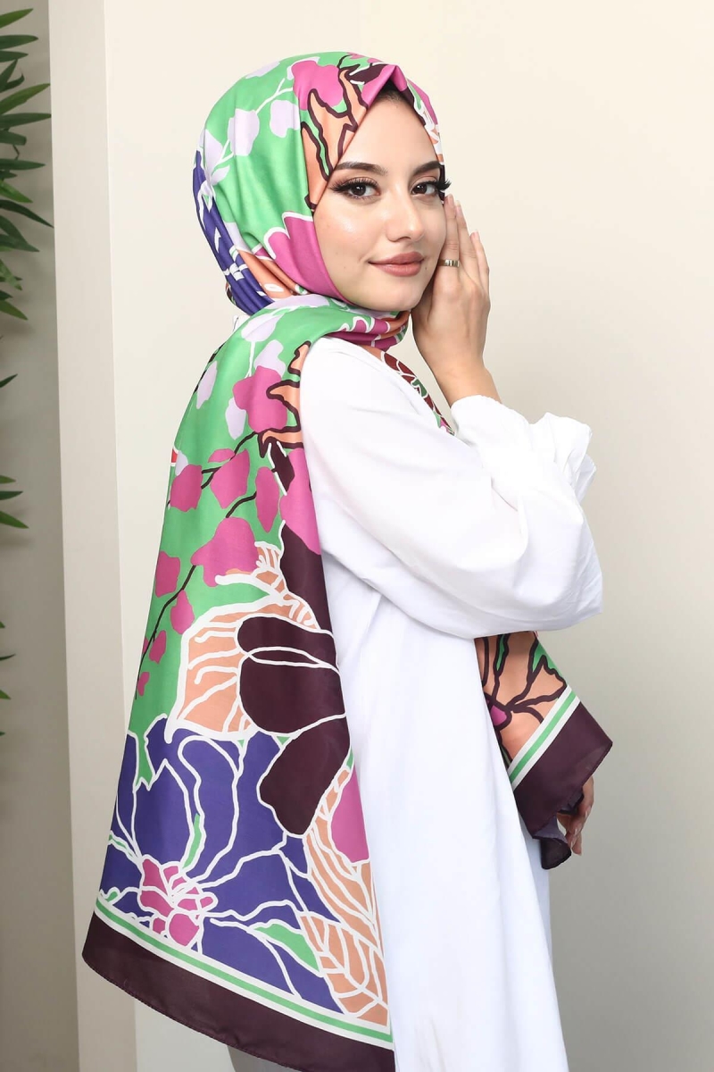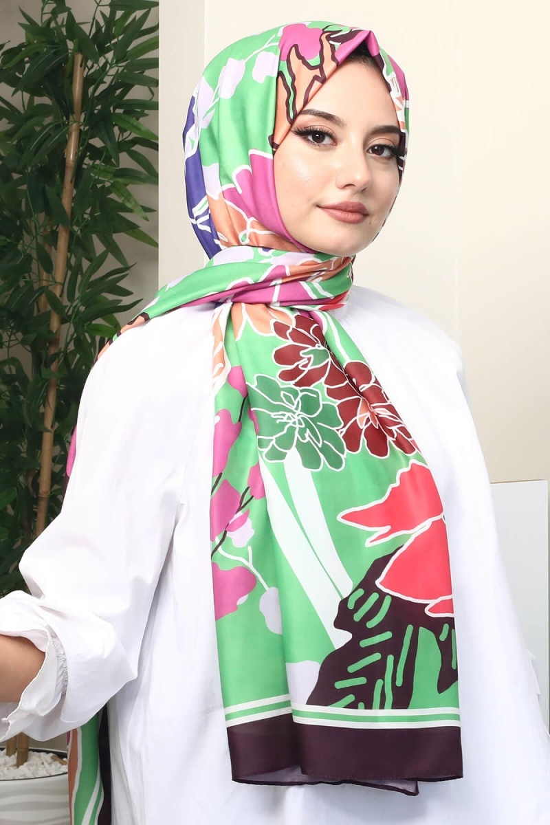 Çiçek Desen Yeşil Soft Pamuk Şal;Ölçü:75x185;Kumaş:%50 Pamuk %50 Polyester;Dört mevsim kullanıma uygundur.;Kolayca şekil alır, önü tok ve dik durur.; Solmaya ve kırışmaya dayanıklıdır.; İç göstermez,kayma yapmaz.; Ütü gerektirmez.;Kullanılan ışıklardan dolayı renk farklılıkları olabilir.
