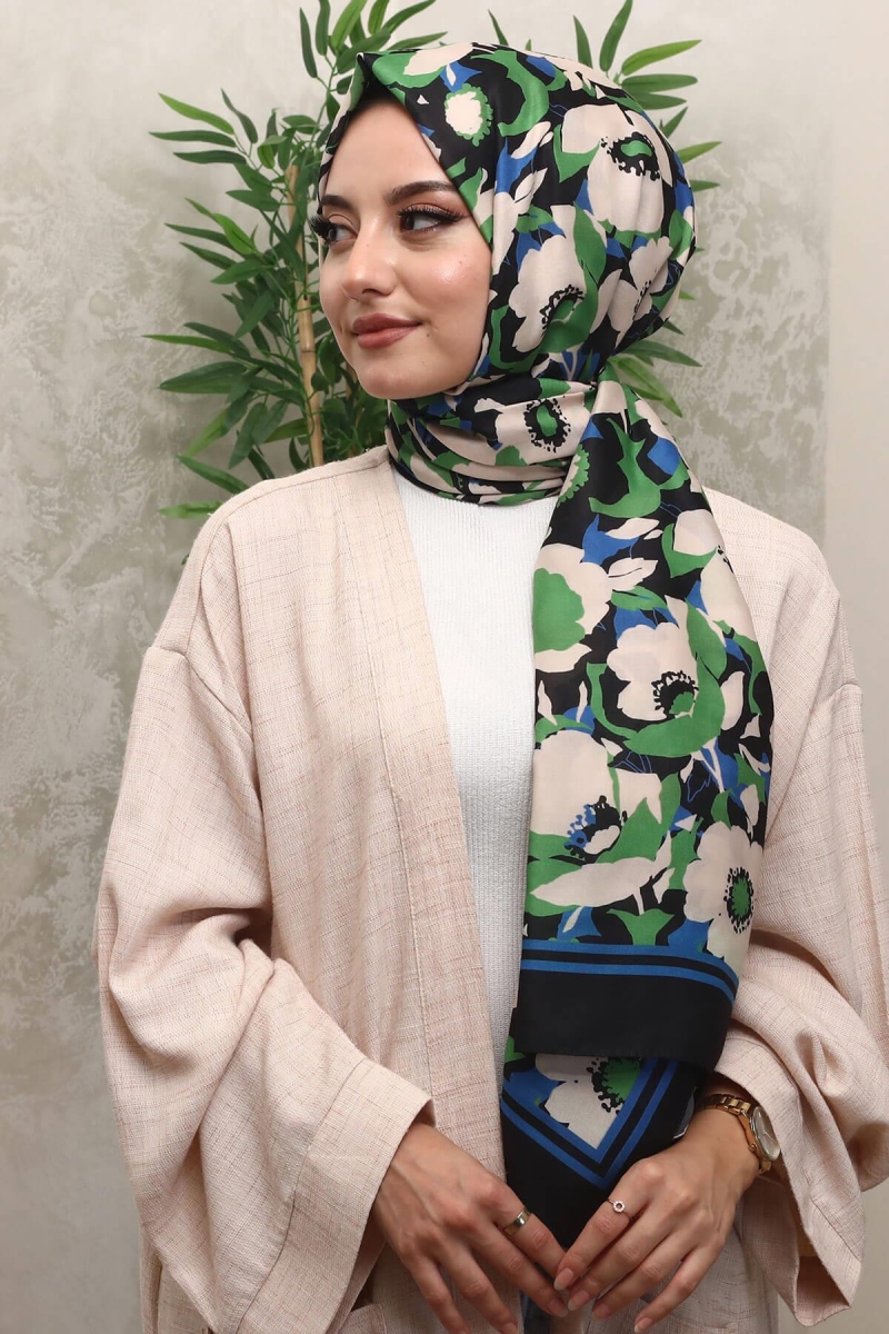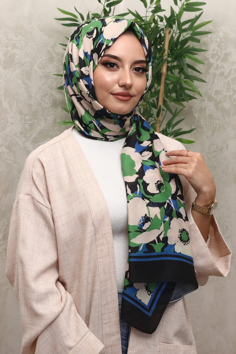 Çiçek Desen Yeşil Soft Pamuk Şal;Ölçü:75x185;Kumaş:%50 Pamuk %50 Polyester;Dört mevsim kullanıma uygundur.;Kolayca şekil alır, önü tok ve dik durur.; Solmaya ve kırışmaya dayanıklıdır.; İç göstermez,kayma yapmaz.; Ütü gerektirmez.;Kullanılan ışıklardan dolayı renk farklılıkları olabilir.