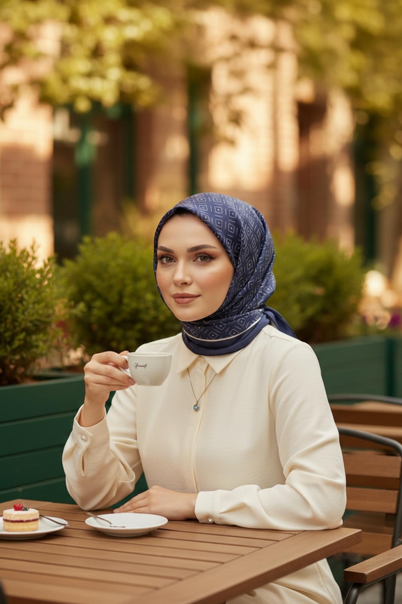 Elmas Motif Desen Lacivert Pamuk Eşarp;Ölçü:95x95;Kumaş:%50 Pamuk %50 Polyester;Dört mevsim kullanıma uygundur.;Kolayca şekil alır, önü tok ve dik durur.; Solmaya ve kırışmaya dayanıklıdır.; İç göstermez,kayma yapmaz.; Ütü gerektirmez.;Kullanılan ışıklardan dolayı renk farklılıkları olabilir.;Dört kenarı püsküllüdür.