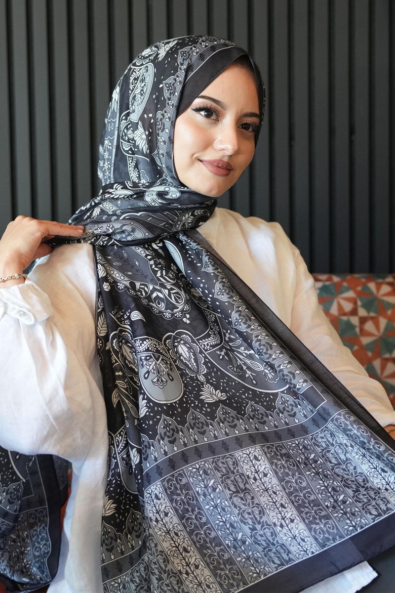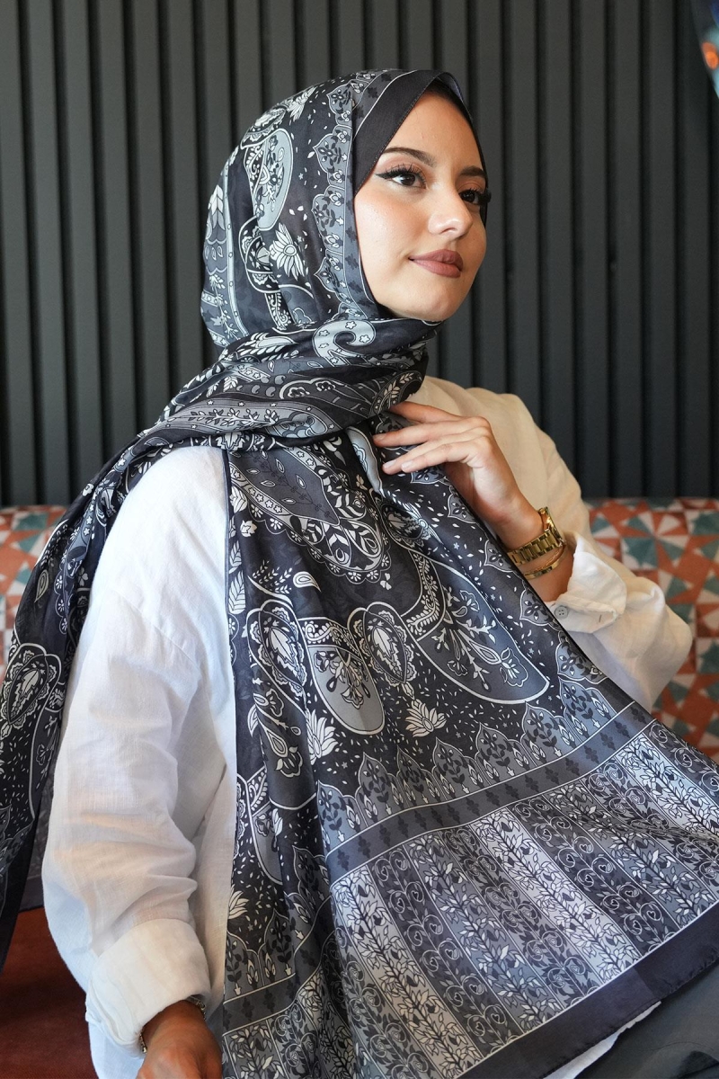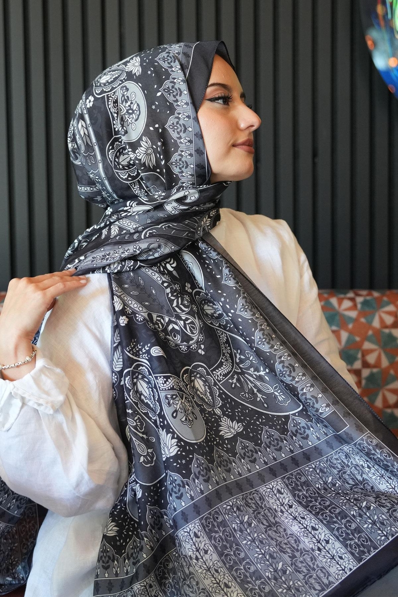 Karma Motif Desen Siyah Soft Pamuk Şal;Ölçü:75x185;Kumaş:%50 Pamuk %50 Polyester;Dört mevsim kullanıma uygundur.;Kolayca şekil alır, önü tok ve dik durur.; Solmaya ve kırışmaya dayanıklıdır.; İç göstermez,kayma yapmaz.; Ütü gerektirmez.;Kullanılan ışıklardan dolayı renk farklılıkları olabilir.