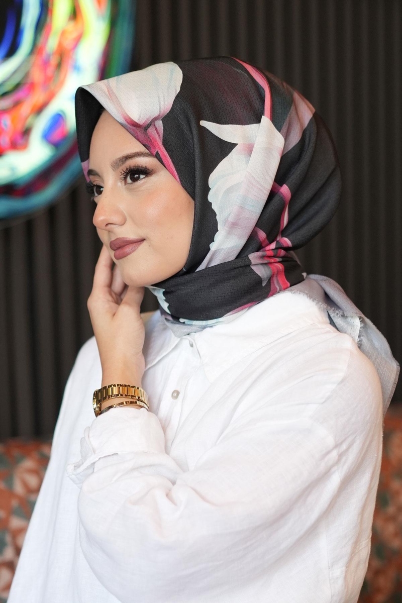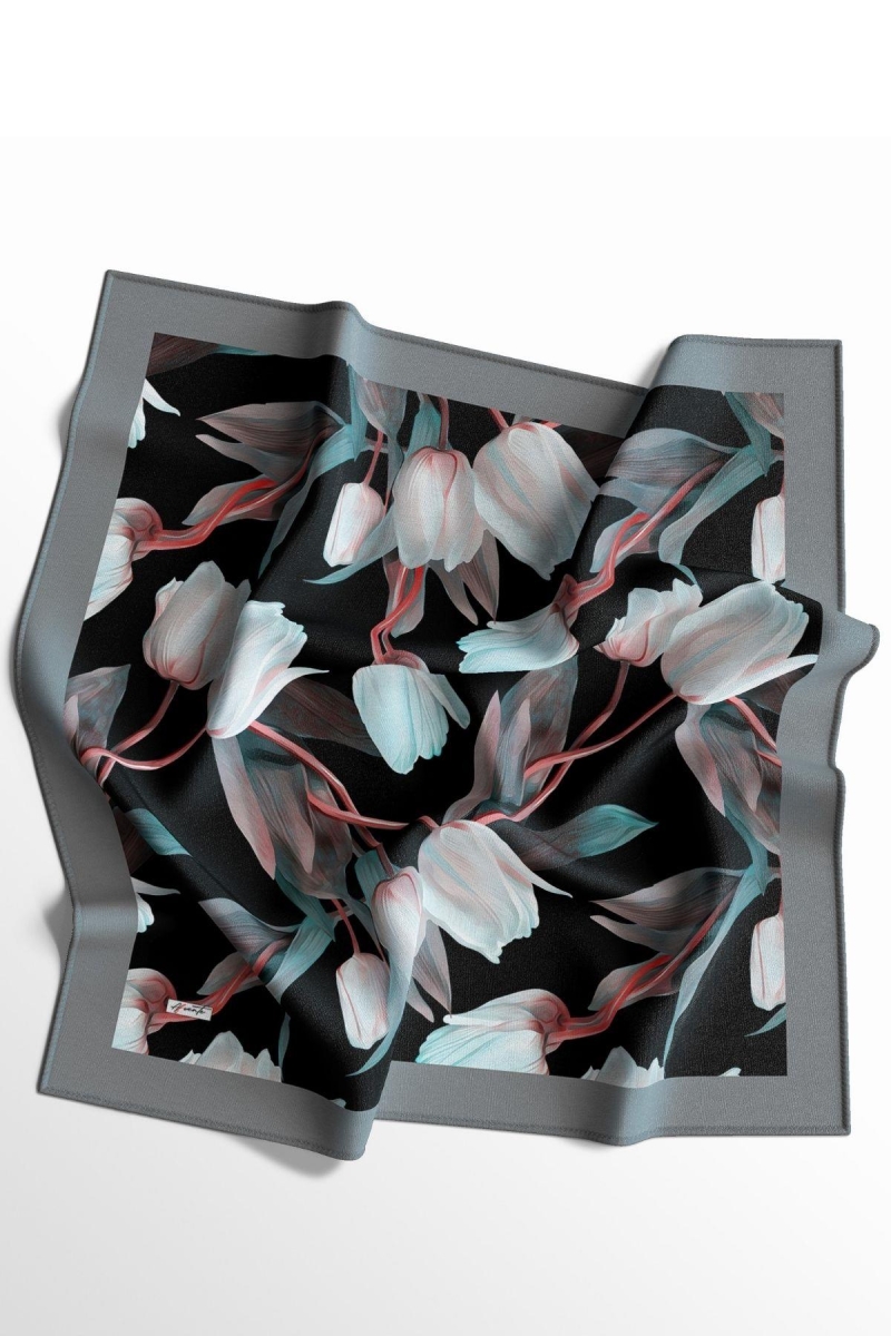 Lale Desen Antrasit Pamuk Eşarp;Ölçü:95x95;Kumaş:%50 Pamuk %50 Polyester;Dört mevsim kullanıma uygundur.;Kolayca şekil alır, önü tok ve dik durur.; Solmaya ve kırışmaya dayanıklıdır.; İç göstermez,kayma yapmaz.; Ütü gerektirmez.;Kullanılan ışıklardan dolayı renk farklılıkları olabilir.