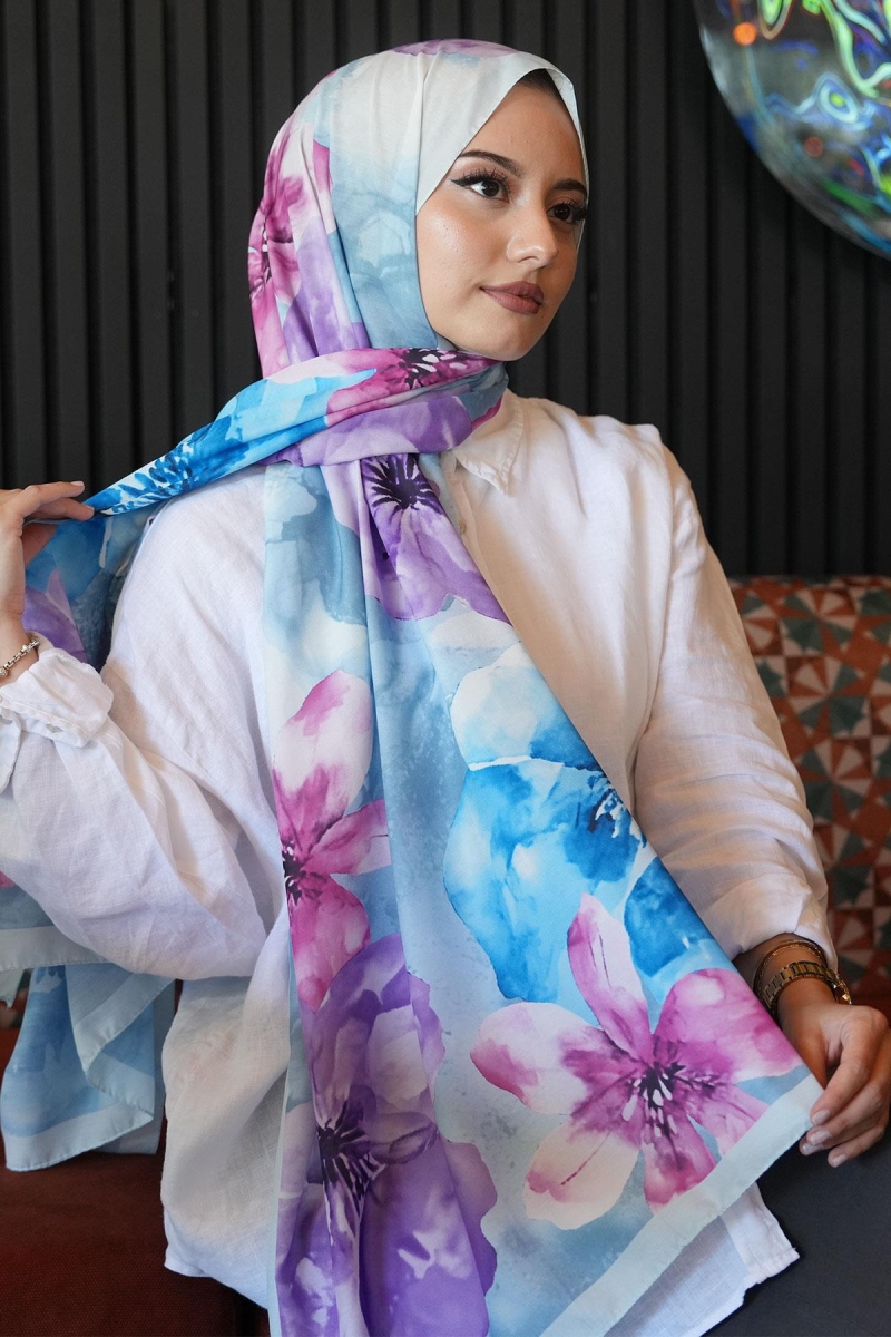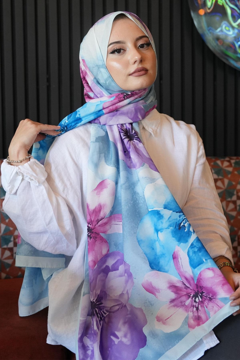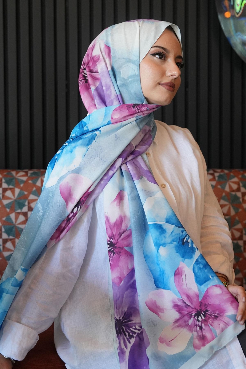 Manolya Çiçek Desen Mavi Soft Pamuk Şal;Ölçü:75x185;Kumaş:%50 Pamuk %50 Polyester;Dört mevsim kullanıma uygundur.;Kolayca şekil alır, önü tok ve dik durur.; Solmaya ve kırışmaya dayanıklıdır.; İç göstermez,kayma yapmaz.; Ütü gerektirmez.;Kullanılan ışıklardan dolayı renk farklılıkları olabilir.