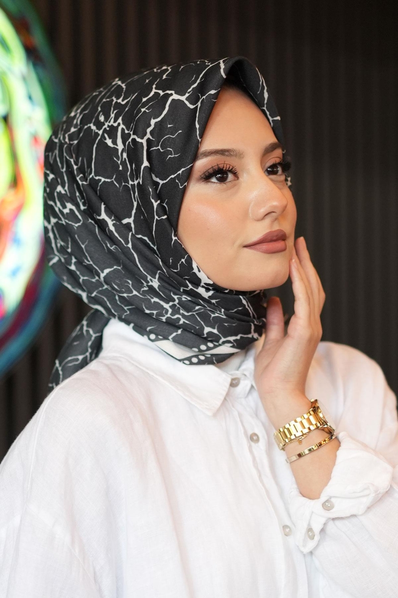 Mermer Desen Beyaz Pamuk Eşarp;Ölçü:95x95;Kumaş:%50 Pamuk %50 Polyester;Dört mevsim kullanıma uygundur.;Kolayca şekil alır, önü tok ve dik durur.; Solmaya ve kırışmaya dayanıklıdır.; İç göstermez,kayma yapmaz.; Ütü gerektirmez.;Kullanılan ışıklardan dolayı renk farklılıkları olabilir.