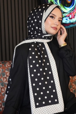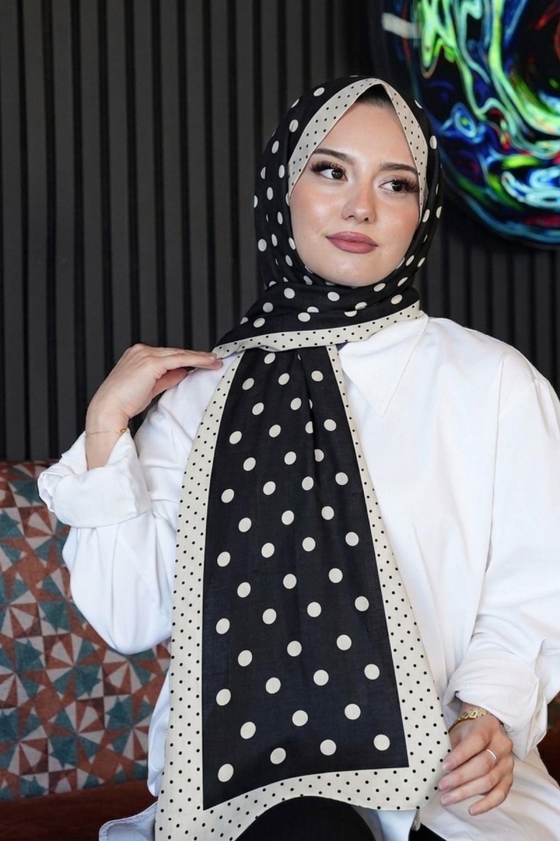 Puantiye Desen Siyah Soft Pamuk Şal;Ölçü:75x185;Kumaş:%50 Pamuk %50 Polyester;Dört mevsim kullanıma uygundur.;Kolayca şekil alır, önü tok ve dik durur.; Solmaya ve kırışmaya dayanıklıdır.; İç göstermez,kayma yapmaz.; Ütü gerektirmez.;Kullanılan ışıklardan dolayı renk farklılıkları olabilir.