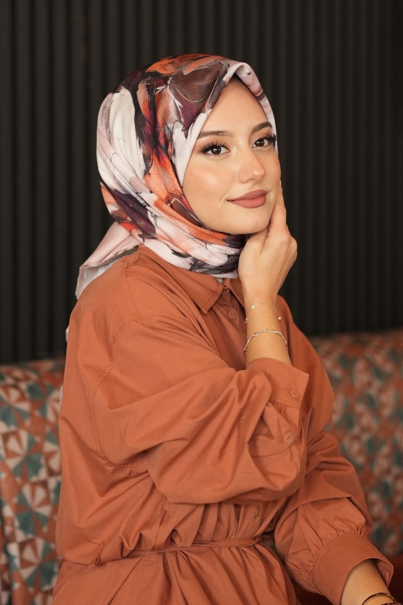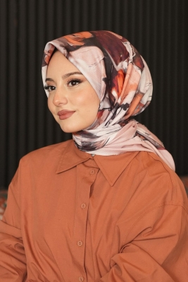 Soyut Gül Desen Yavruağzı Pamuk Eşarp;Ölçü:95x95;Kumaş:%50 Pamuk %50 Polyester;Dört mevsim kullanıma uygundur.;Kolayca şekil alır, önü tok ve dik durur.; Solmaya ve kırışmaya dayanıklıdır.; İç göstermez,kayma yapmaz.; Ütü gerektirmez.;Kullanılan ışıklardan dolayı renk farklılıkları olabilir.