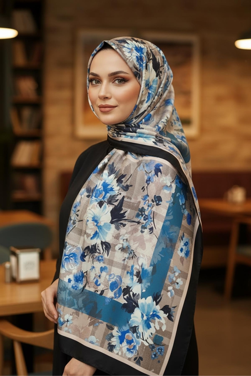 Su Çiçeği Desen Mavi Pamuk Şal;Ölçü:75x185;Kumaş:%50 Pamuk %50 Polyester;Dört mevsim kullanıma uygundur.;Kolayca şekil alır, önü tok ve dik durur.; Solmaya ve kırışmaya dayanıklıdır.; İç göstermez,kayma yapmaz.; Ütü gerektirmez.;Kullanılan ışıklardan dolayı renk farklılıkları olabilir.