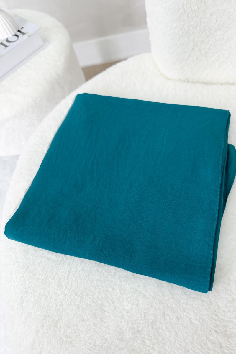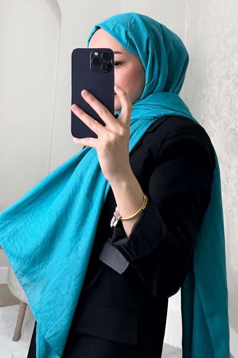 Turkuaz Kraş Pamuk Şal;Ölçü:80x185;Kumaş:%50 Pamuk %50 Polyester;Dört mevsim kullanıma uygundur.;Kolayca şekil alır, önü tok ve dik durur.; Solmaya ve kırışmaya dayanıklıdır.; İç göstermez,kayma yapmaz.; Ütü gerektirmez.;Kullanılan ışıklardan dolayı renk farklılıkları olabilir.
