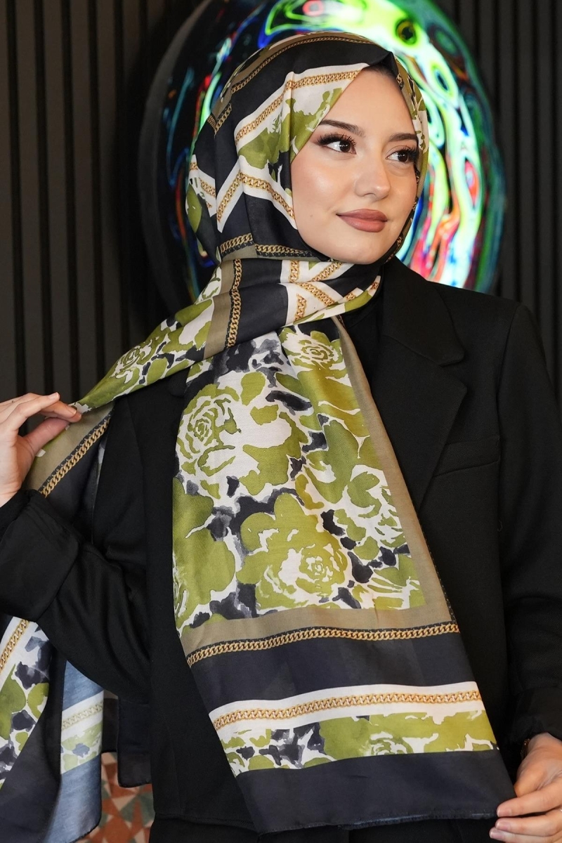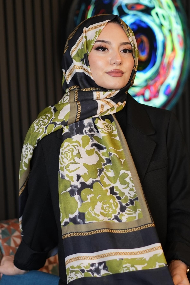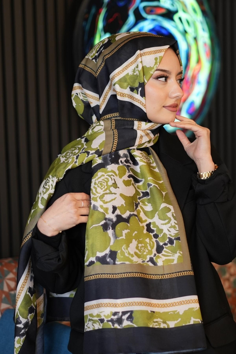 Zincir Gül Desen Yağ Yeşili Pamuk Şal;Ölçü:75x185;Kumaş:%50 Pamuk %50 Polyester;Dört mevsim kullanıma uygundur.;Kolayca şekil alır, önü tok ve dik durur.; Solmaya ve kırışmaya dayanıklıdır.; İç göstermez,kayma yapmaz.; Ütü gerektirmez.;Kullanılan ışıklardan dolayı renk farklılıkları olabilir.