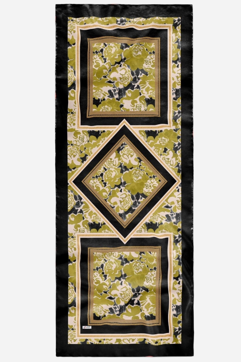 Zincir Gül Desen Yağ Yeşili Pamuk Şal;Ölçü:75x185;Kumaş:%50 Pamuk %50 Polyester;Dört mevsim kullanıma uygundur.;Kolayca şekil alır, önü tok ve dik durur.; Solmaya ve kırışmaya dayanıklıdır.; İç göstermez,kayma yapmaz.; Ütü gerektirmez.;Kullanılan ışıklardan dolayı renk farklılıkları olabilir.Dört kenarı italyan dikişlidir.